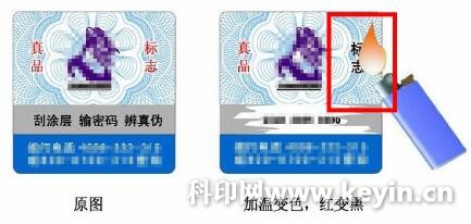 防伪油墨是标签防伪技术体系中的一个重要部分,防伪油墨是指具有防伪功能的油墨,同样由色料、连结料和油墨助剂组成,但在油墨连结料中加入了特殊性能的防伪材料并经特殊工艺加工而成,是特种印刷油墨。市面上主流的防伪油墨一般有紫外荧光油墨、日光变色油墨、热敏油墨、化学反应变色油墨、水敏防伪油墨等等。用紫外荧光油墨印刷的产品,在专用的防伪荧光灯照射下,采用防伪荧光油墨印刷的标记会发亮,呈现出鲜艳的红、橘红、黄绿或绿色荧光,其荧光强度高,印刷适应性好,光亮消失也很快,在紫光灯关闭后,光亮即刻消失。日光变色油墨在日光的照射下会有字码出现。热敏油墨在加热后变色,冷却后图形又复原(如图1所示),属于可逆变色油墨。