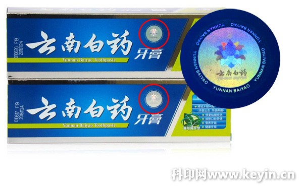 烫印标签的防伪力度已经远高于普通的不干胶标签,如这两年刚刚换上新标签的云南白药(如图2所示),其包装上的防伪标签就是一枚烫印标签。此标签在侧光下反射性较好,颜色绚丽,宝相花颜色层次感清晰,均匀分布在圆内,且圆周外的拼音字母清晰,笔画粗细一致,是一枚精致的烫印标签。高分辨率,三维真彩色,反射角变色,动画文字图标,小舍纹理,象元变换,高清同位异象,象元字符等,都属于高级别的光学防伪技术。
