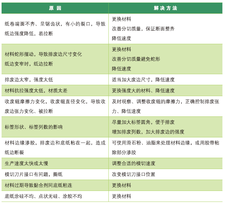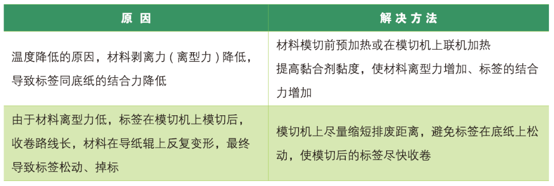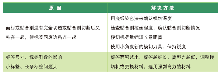 总之,受不干胶材料理化特性的影响,要想模切时降低掉标的发生概率,一定要严格控制模切刀的角度、标签排废边的尺寸以及环境温度。只有这样,在正确调整设备的情况下,才能有效保证不干胶材料的模切质量和生产效率。