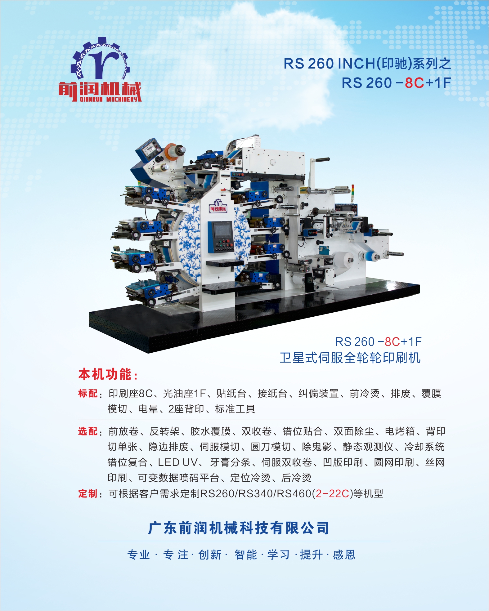 伺服RS260/340通过伺服多工艺组合优化标签印刷工艺,免更换磁性管,磁性刀皮用量更少,降低了使用成本。离线模切二次追位模切,可实现电子追踪位置,实现无人看管模式。受到客户的青睐。停机启动套印不跑位,伺服系统控制伺服放卷和收卷;举例讲:片材印刷,市场上基本上是750米/卷,传统卫星式凸版印刷机械每卷会浪费20几米的材料是因为套印跑动而导致的,我们伺服系统控制的只需要很小损坏,通过长期验证测试我们的数据是小于1米,甚至有些材料稳定一些的只要丢弃接卷接头前后2张标签,这个对于印刷企业来讲是长期可以省去一笔很大费用,按照每天产出30000米计算*240mm宽幅,一天需要换卷材料40次,例如材料是6元每平方,一天换接料40次,青花瓷伺服设备每天一台设备节约材料1200元,一月省30000左右,一年省400000万左,套位准省钱的设备你们喜欢??吗?