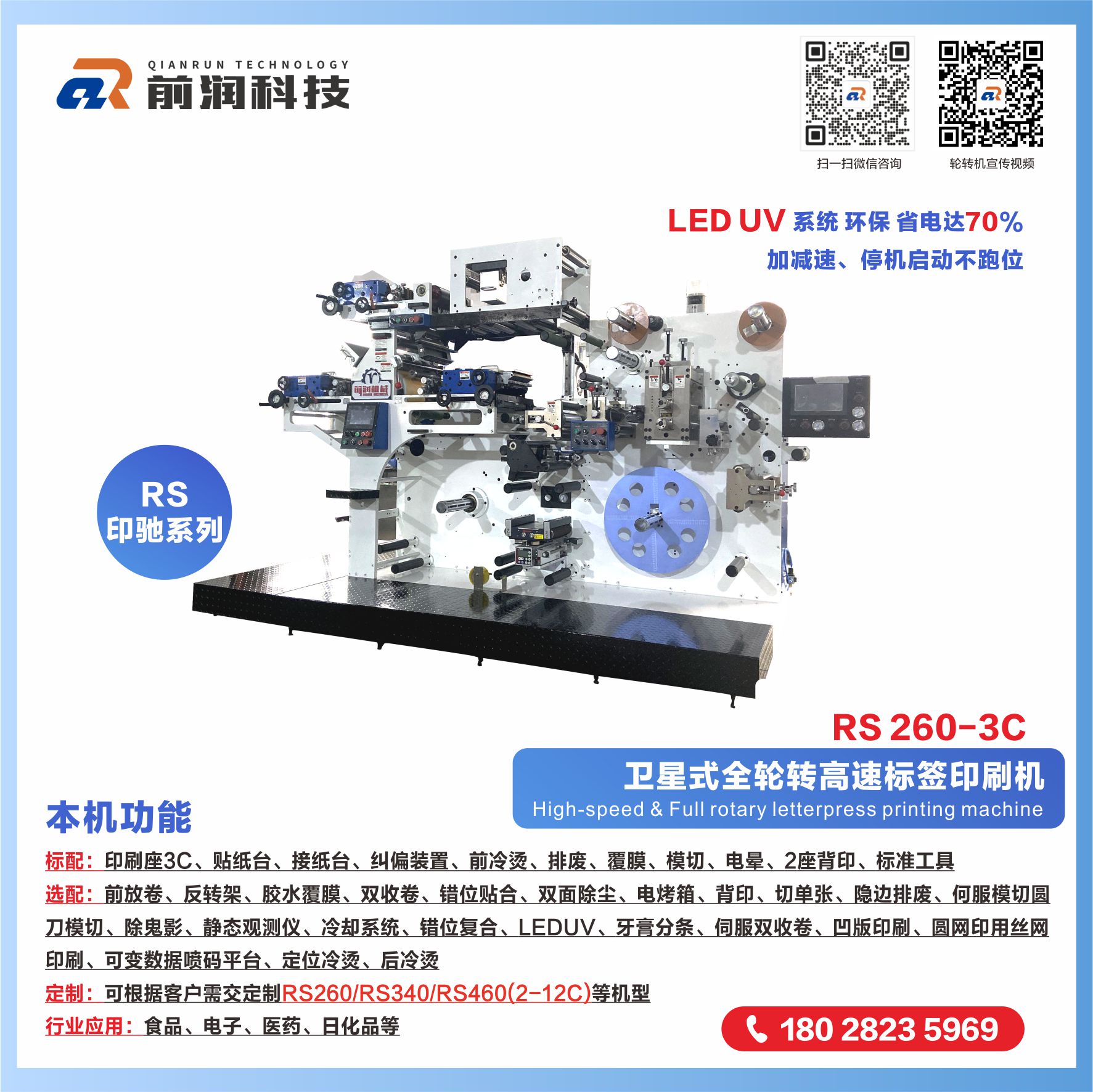 主营设备:商标印刷机、卫星式轮转印刷机、模切机 等产品,公司可为客户量身制定商标机、轮转机等自动化解决方案。公司有强大的研发体系,确保能为客户量身定制各类非标且最有价值的产品;前润机械在国内外拥有极高的市场占有率及良好的信誉,赢得了众多知名企业的青睐与合作,产品畅销多个国家和地区,市场销量近万台;我们愿与您携手合作,建立长久双赢机制,共享成功喜悦!加盟热线:133 2260 8282